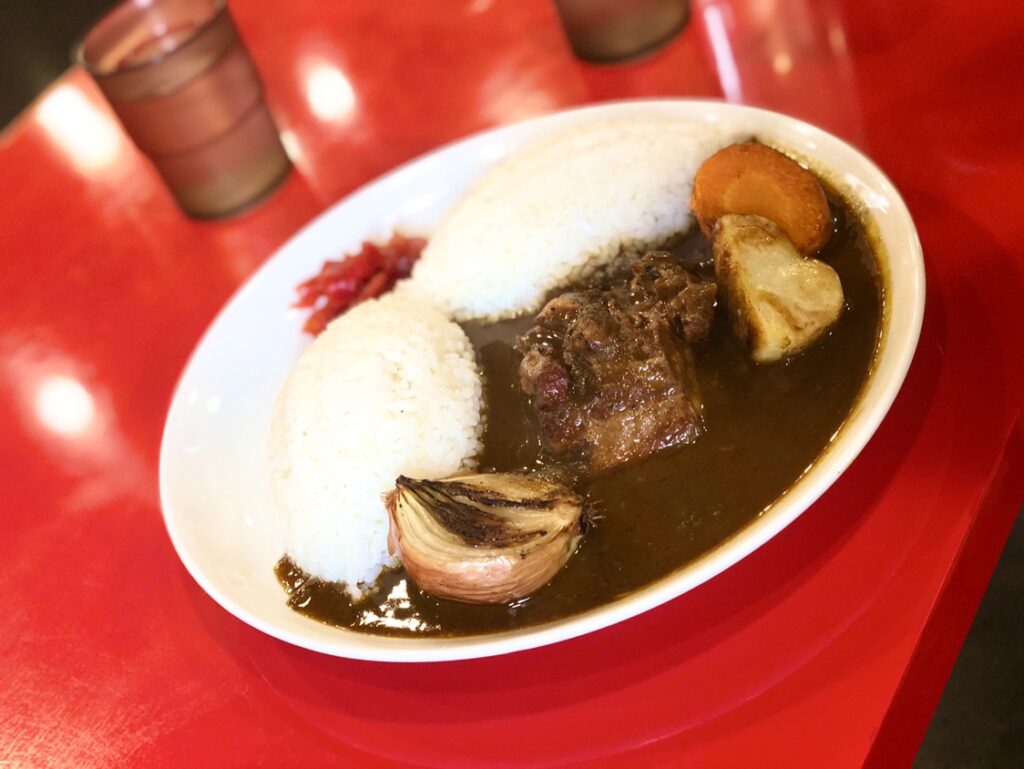 旨味とコクの効いたスパイスたっぷりの欧風カレーが評判のこちらのお店。看板メニューの「上々豚カレー」は、トロトロに煮込まれた豚肉の塊とたっぷりの焼き野菜が入った一皿。ふた山に盛られたご飯に加えて、セルフサービスの福神漬けや箸休めにちょうど良いお惣菜も自由にトッピング可能なので、ボリュームも満点(しかも、ルーはお替りが無料です!)。